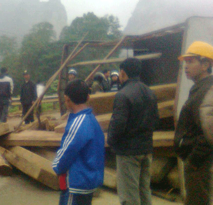 | Hiện trường xe chở gỗ bị lật |