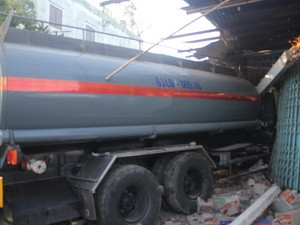 Chiếc xe bồn chở hóa chất húc đổ cửa nhà dân.