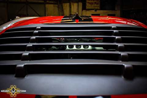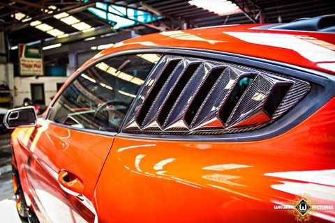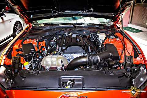 | Đi kèm với bộ bodykit là nắp ca-pô bằng sợi carbon với khe hút gió làm mát mới, cộng với phần cản trước đã gần như hoàn toàn thay đổi thiết kế phần đầu của chiếc Mustang. Thay vì sơn hoàn toàn nắp ca-pô, chủ xe đã chỉ sơn màu cam trùng với thân xe dọc 2 khe hút gió và để trần lớp sợi carbon. |