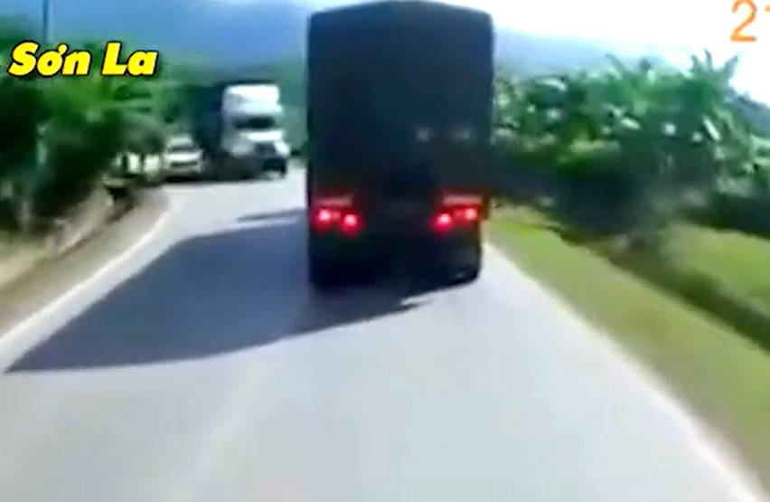 Tại khúc cua trên quốc lộ 6 (Yên Châu, Sơn La) ô tô con màu trắng đỗ lấn hết làn đường khiến xe container đi phía sau đánh lái tránh xe đi ngược chiều.