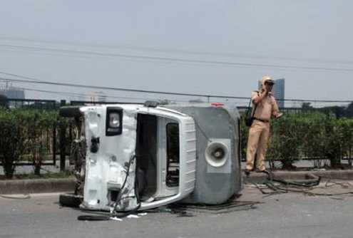 | Xe công an tông dải phân cách lật nhào ra đường |