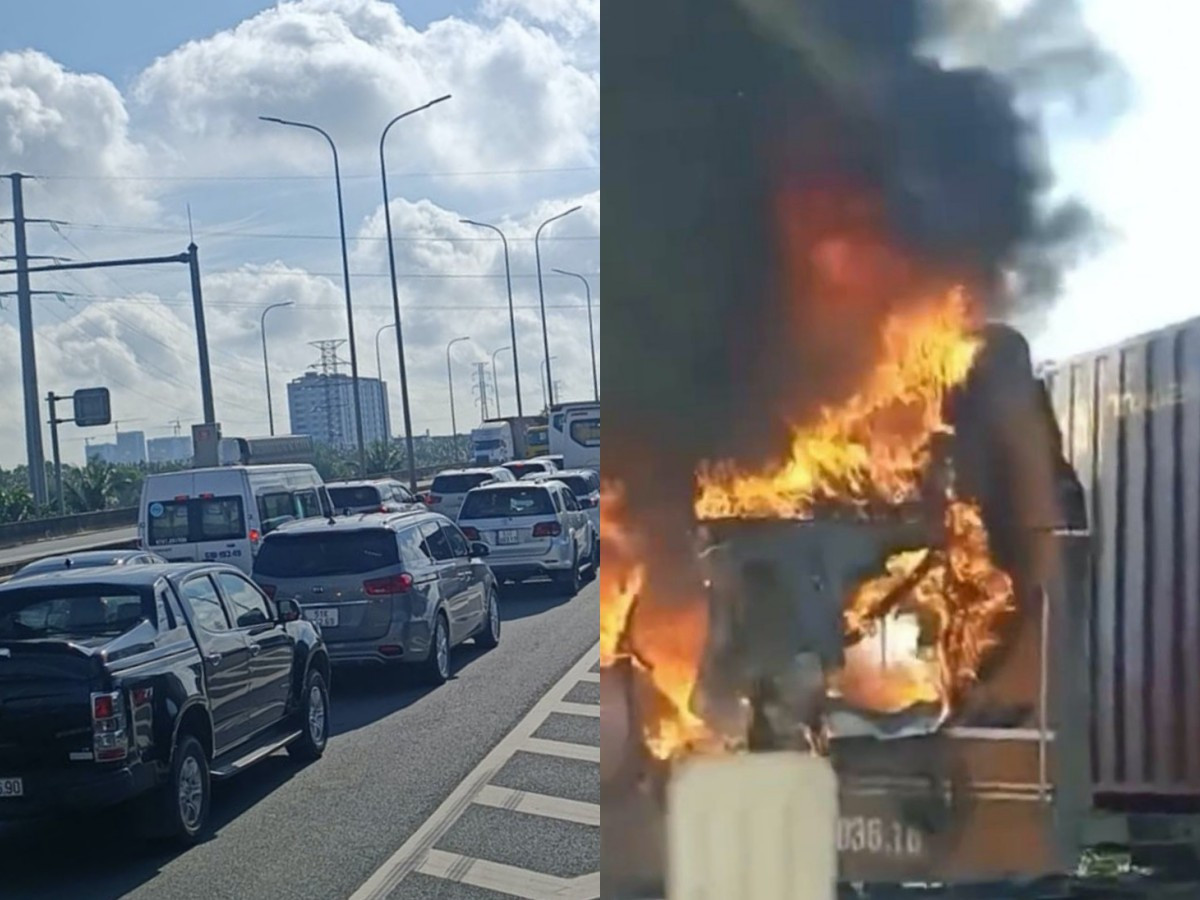 Xe container bốc cháy ngùn ngụt khiến cao tốc Long Thành - Dầu Giây ùn tắc.