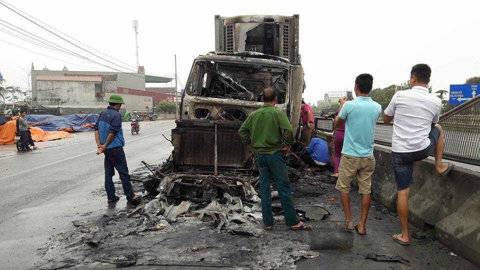 Theo tài xế container, cabin xe có nhiều tài sản, giấy tờ và tiền mặt bị thiêu trụi, ước tính thiệt hại cả trăm triệu đồng.