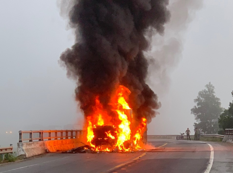 Khi đến Km1080+100 (huyện Mộ Đức), phần đầu container bất ngờ bốc cháy dữ dội, sau đó lan ra phần khung xe. Phát hiện đám cháy bốc lên, tài xế container chủ động tháo chạy thoát thân.