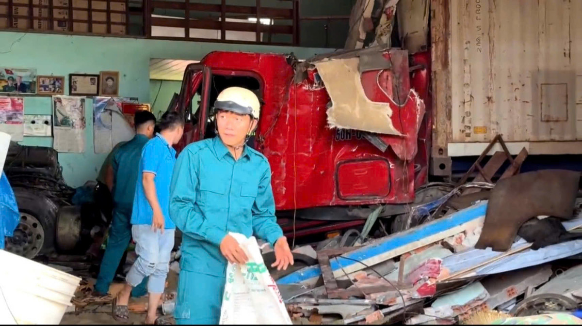 6 ngôi nhà và tài sản trong nhà bị xe tông hư hỏng, thiệt hại nặng. Xe container do anh Trưởng lái bị vỡ nát phần đầu và nhiều bộ phận khác.