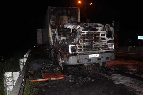 Khi đến địa điểm trên bất ngờ đầu xe bùng cháy. Lúc này tài xế container vội tấp xe vào lề đường đồng thời bung cửa để cùng phụ xe thoát hiểm ra ngoài an toàn.
