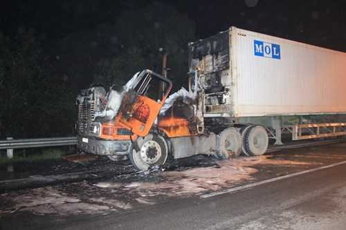 (VTC News)- Đang lưu thông trên đường chiếc container kéo theo rơ móc bất ngờ cháy lớn làm thiêu rụi phần đầu, tài xế và phụ xe thoát chết trong gang tấc.