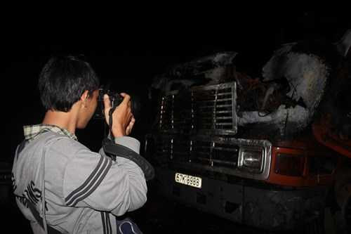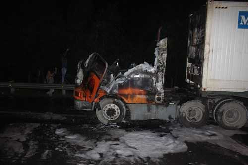 Đầu xe container bị lửa bao trùm nhanh chóng khiến tài xế và phụ xe cũng như người dân xung quanh bất lực đứng nhìn.