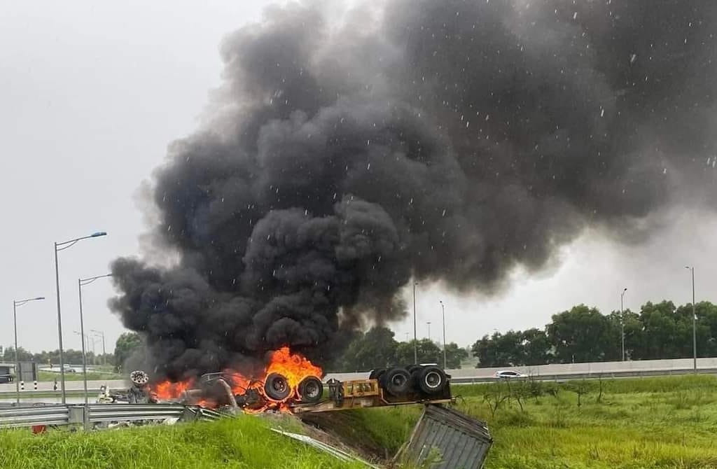 Sau cú va chạm, phần thân xe bốc cháy, lửa lan lên cabin thiêu rụi toàn bộ phần đầu xe. Thời điểm chiếc xe cháy, trời đang mưa lớn. Rất may vụ việc không gây thiệt hại về người.