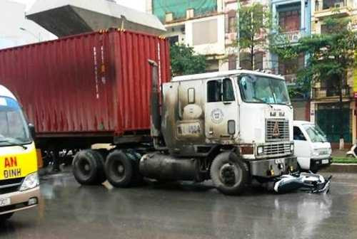 Tuy nhiên, lái xe không dừng lại mà tiếp tục cho xe tiến lên và đẩy xe cảnh sát ngã ra đường. Xe máy của lực lượng CSGT mang biển số 29B1-006.86 đổ ngang ra đường, mắc kẹt phần đuôi và bánh sau vào đầu xe container.