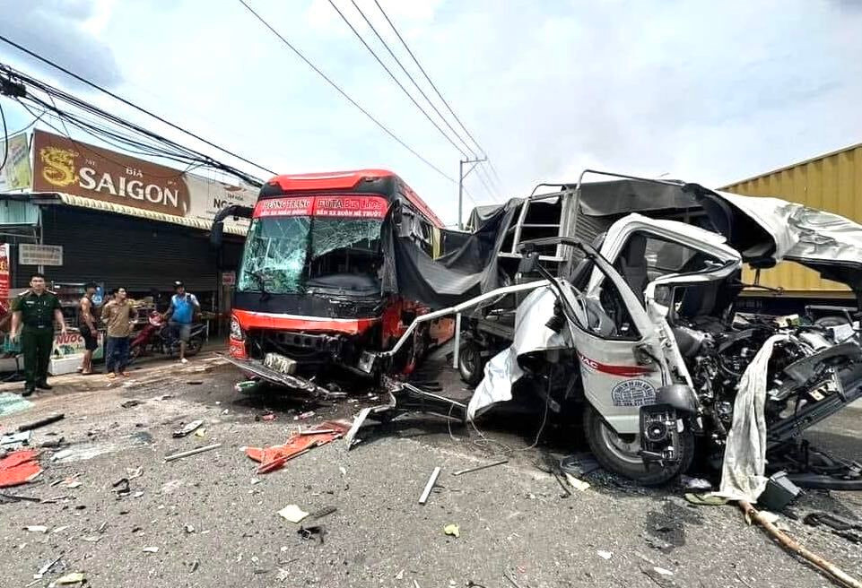 Tại hiện trường, xe container cháy phần đầu kéo, đã được dập tắt. Riêng xe tải, phần đầu xe biến dạng hoàn toàn. Xe khách Phương Trang hư hỏng nặng.