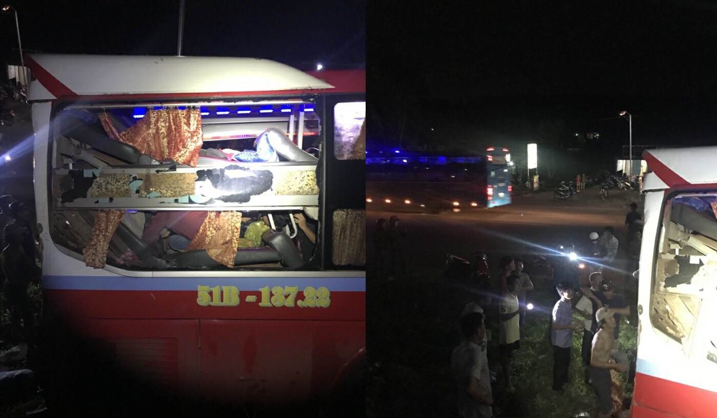 Khi đến địa điểm trên, xe khách bị xe container mang BKS: 51D - 15743 (chưa rõ danh tính người cầm lái) đang đi cùng chiều tông vào đuôi và văng xa gần 100m.