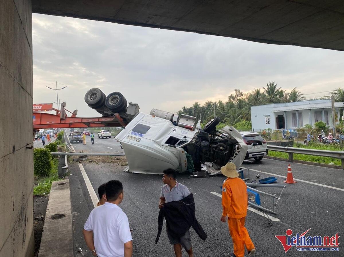 5h sáng 19/4, xe container BKS: 50H 02064 kéo rơ móc BS: 51R 40407 chạy trên cao tốc TP.HCM - Trung Lương hướng từ TP.HCM đi Tiền Giang, khi đến km 32+00, xe bất ngờ mất lái đâm vào dải phân cách tôn sóng giữa cao tốc.
