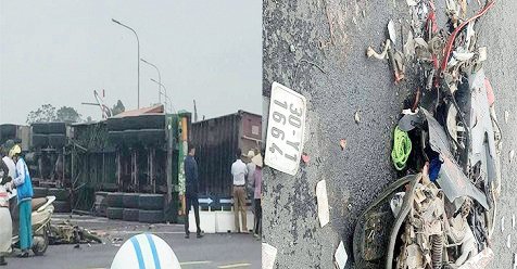 Vụ va chạm khiến xe container lật nghiêng, thùng hàng phía sau đè trúng 2 nạn nhân đi xe máy, rồi kéo lê khoảng 10m. Tại hiện trường, chiếc xe máy biến dạng, xe container nằm nghiêng bên vệ đường.