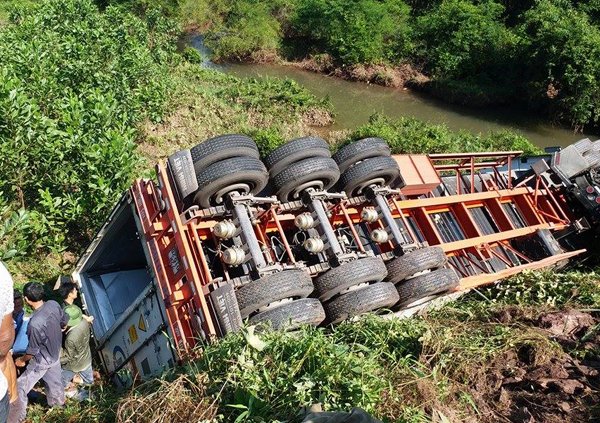 Theo đó, vào thời điểm trên, chiếc xe container kéo theo rơ moóc mang BKS 72R-01526 đang lưu thông trên đường bỗng lao thẳng xuống vực rồi lật ngửa. Rất may tài xế đã kịp thoát thân, không có thiệt hại về người.