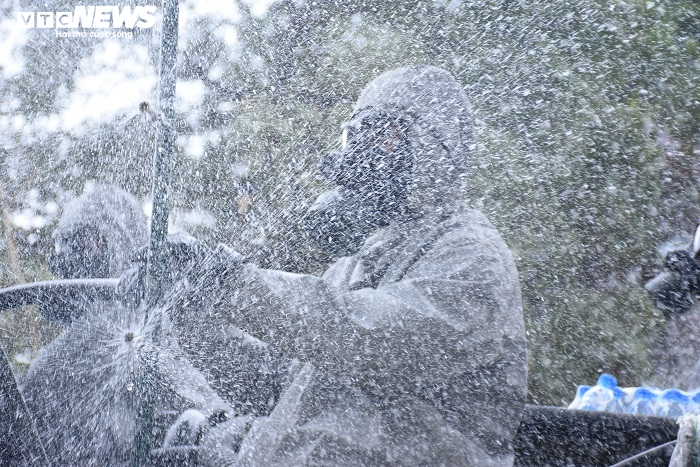 Tất cả được trang bị mặt nạ chống độc, quần áo bảo hộ khi phun khử trùng.