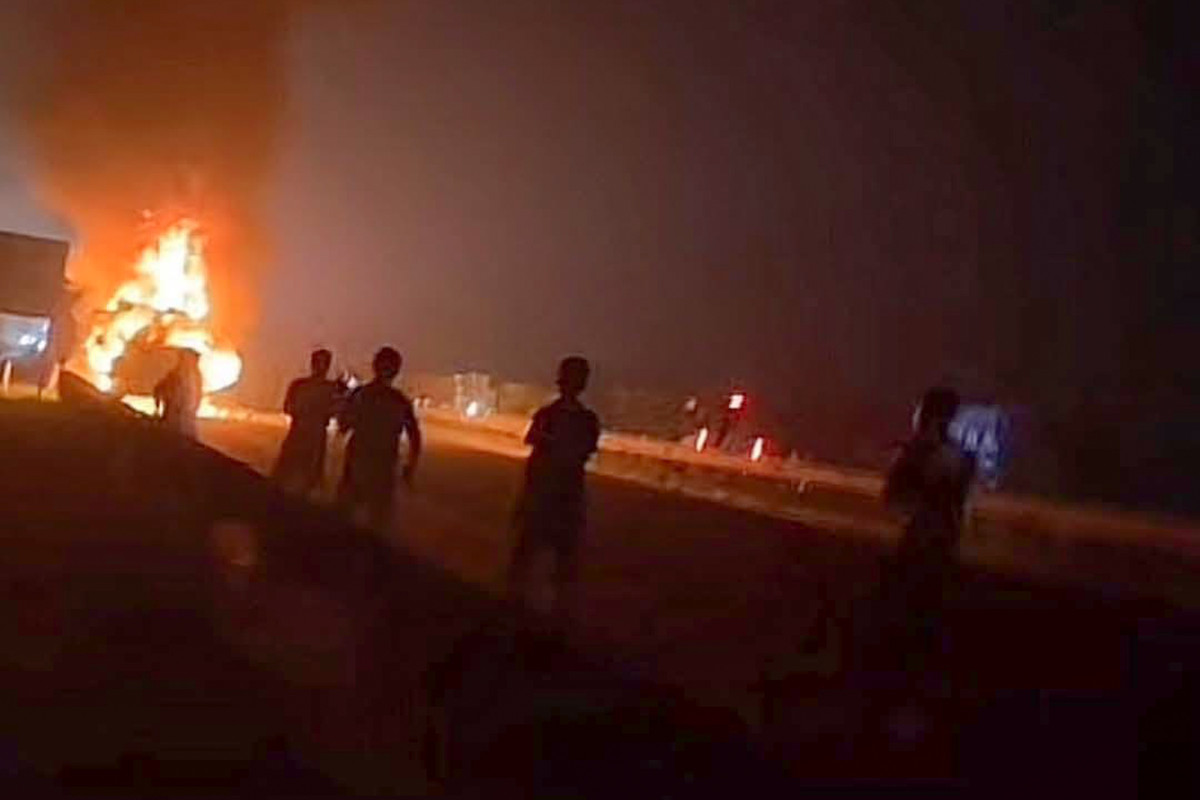 Tại hiện trường, xe đầu kéo nằm sát dải hộ lan bên phải đường, phần đầu xe bị cháy rụi hoàn toàn.