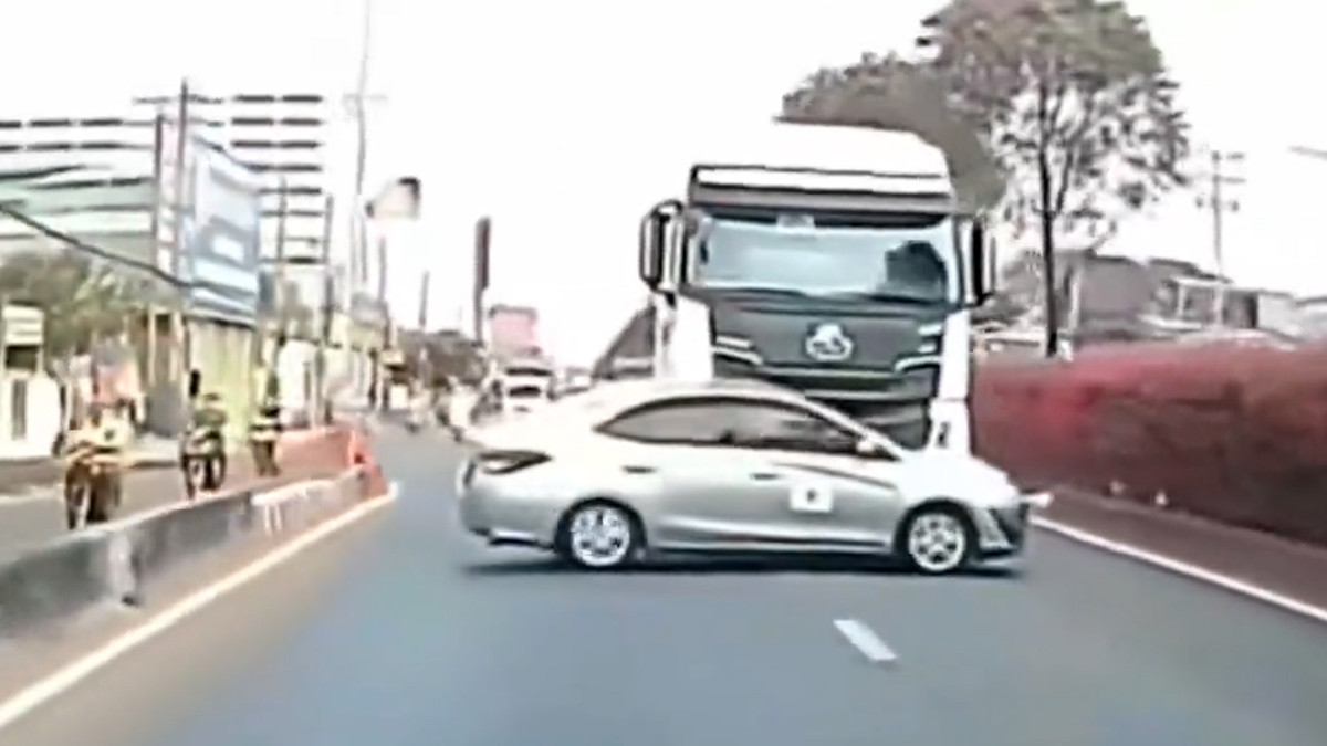 Xe đầu kéo bất ngờ lấn làn tông trúng xe ô tô con khiến chiếc xe xoay ngang đường trên quốc lộ 22, huyện Hóc Môn, TP.HCM.