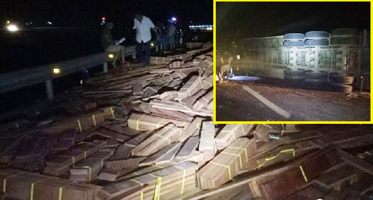 Cú đâm mạnh khiến 10 m dải phân cách cứng trên quốc lộ bị đổ gãy, hàng chục tấn gỗ trên xe tràn ra mặt đường. Trục trước cùng 2 bánh của ô tô văng ra, rơi lìa khỏi cabin. Rất may, tài xế xe tải không bị thương vong.