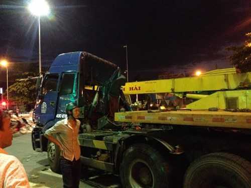 Thời điểm trên, xe đầu kéo mang mang BKS 43C-07675 kéo theo rơ móc 43R-00888 chở bánh sắt nặng hơn 40 tấn lưu thông trên đường Cách mạng tháng Tám, khi đến cột đèn tín hiệu giao Nguyễn Hữu Thọ bất ngờ thắng gấp.