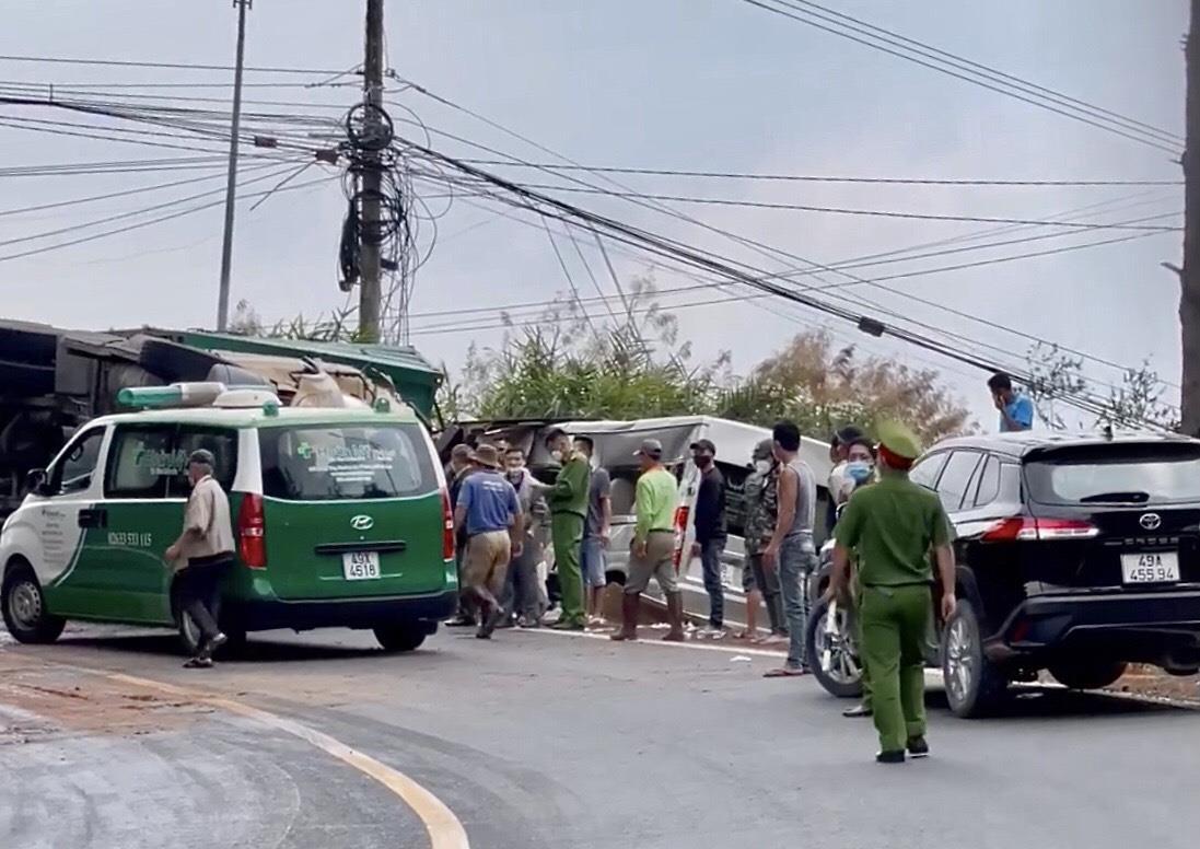 Tại hiện trường, xe đầu kéo lật nghiêng, xe 16 chỗ bị đẩy dạt vào trong lề đường, hai xe hư hỏng nặng.