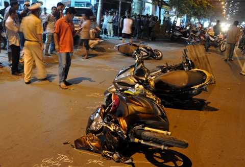Khi còn cách bệnh viện quận 12 khoảng 500m, chiếc xe mất lái lao qua làn đường ngược lại tông vào 4 chiếc xe máy đang chạy trên đường khiến 2 phụ nữ bị thương nặng.