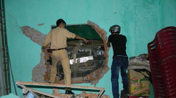Sau khi húc sập bờ tường, cột và bàn ghế trong quán, chiếc xe tiếp tục húc bể tường, chui xuyên cả đầu xe vào nhà dân liền kề, làm hàng chục tấm kính bị hỏng, đồ đạc và xe máy bị ngã đổ.