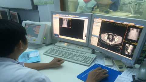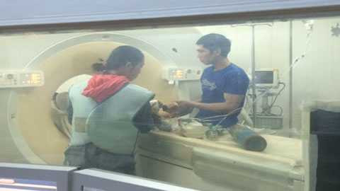 | Anh Vương đang được chụp MRI lần 2 tại Bệnh viện Thống Nhất. Ảnh: Thanh Huyền. |