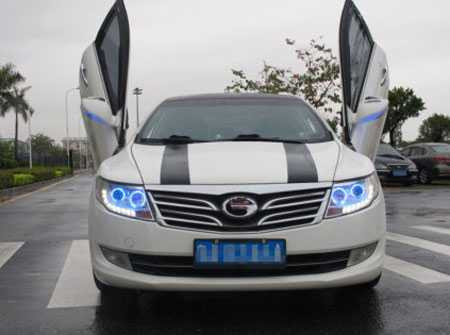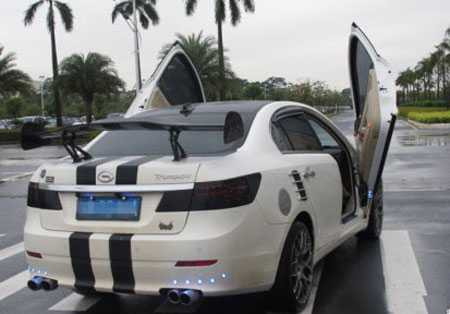 Mới đây tại đảo Hải Nam, Trung Quốc, người đi đường không khỏi trầm trồ khi bắt gặp một “chú” Trumpchi đến từ hãng xe Quảng Châu “diện” bộ cửa tương tự của siêu xe Ý Lamborghini. “Nhái” ý chang kiểu cửa cắt kéo mở lên trên rất đặc trưng ở các dòng xe Lamborghini, mẫu sedan “Tàu” toát lên vẻ dũng mãnh, oai vệ.