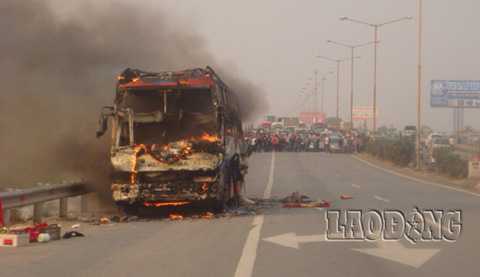 Tại hiện trường, chiếc xe khách 2 tầng bị thiêu rụi hoàn toàn. Rất may không có thiệt hại về người.