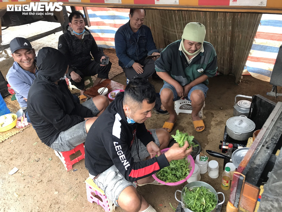 Họ tụ họp lại với nhau thành từng nhóm, cùng nấu nướng, ăn uống. Những người đơn lẻ thì nấu nướng ngay bên sườn xe. “Thực phẩm, bếp gas mini chúng tôi mang theo vì biết trước thế nào cũng phải chờ đợi. Nhưng phải đợi cả nửa tháng rồi, lương thực cũng dần cạn kiệt, đây là bữa ăn cuối cùng rồi, từ mai phải ăn mì tôm thôi”, một tài xế cho biết.
