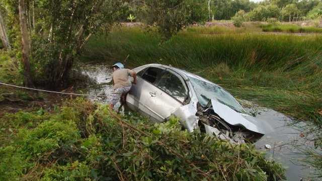 Ôtô 4 chỗ chạy từ hướng thị xã Kiến Tường về TP.Tân An bất ngờ mất lái, lao xuống ruộng ven đường.