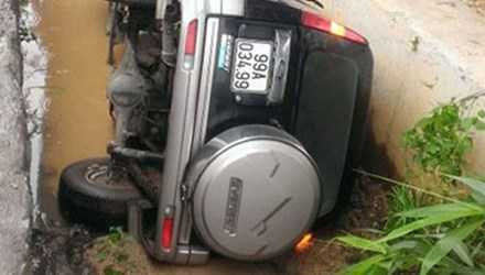 Đang lưu thông trên đường, xế hộp bỗng đột ngột tăng tốc và "chui" xuống cống thoát nước, lật nghiêng.