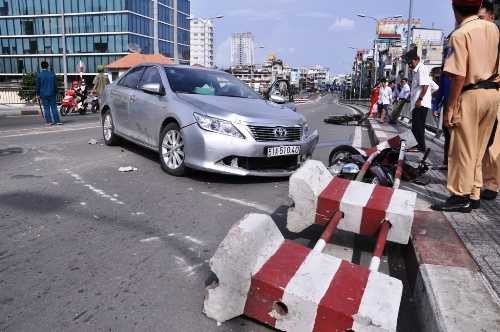 Tại hiện trường, xe ô tô bị bể bánh, phần đầu hư hỏng nặng. Hơn 20m dải phân cách bị bứng lên khỏi mặt đường. Hai xe máy bị hư hỏng, riêng chiếc xe tay ga Visson bị khối bê tông của dải phân cách đè lên nát bét phần đầu.