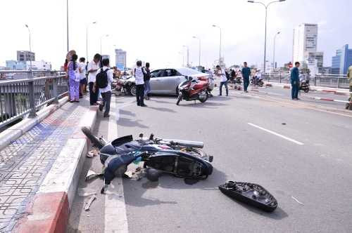 Chiếc ô tô “điên” chỉ chịu dừng lại khi kéo lê dải phân cách cùng chiếc xe máy tay ga hiệu Visson tông vào thành cầu Calmette.