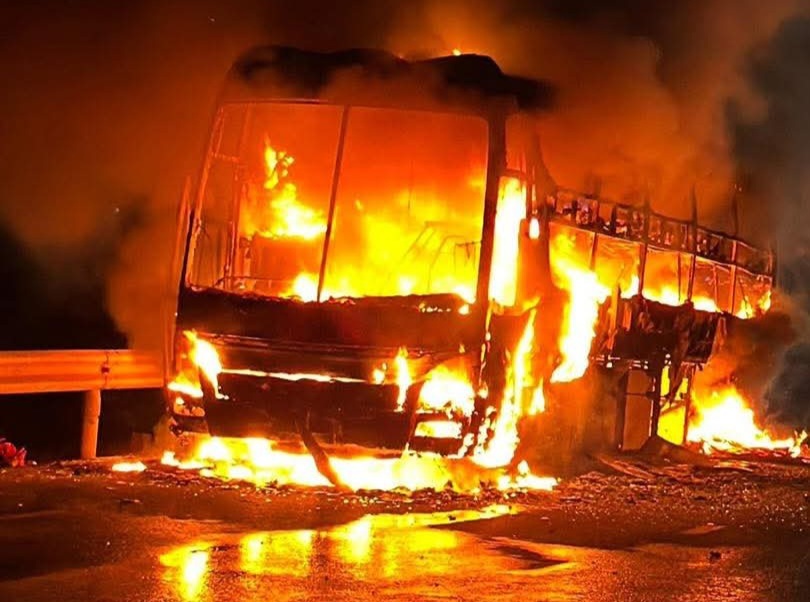 Riêng xe khách bốc cháy dữ dội, lan rộng ra toàn bộ xe và cháy rụi chỉ còn trơ khung. Thiệt hại ban đầu ước tính khoảng 3 tỷ đồng.