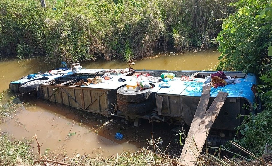 Cú va chạm khiến xe khách lao xuống suối, tài xế và phụ xe bị thương được đưa đi cấp cứu. Các hành khách may mắn được người đi đường đưa ra ngoài an toàn.
