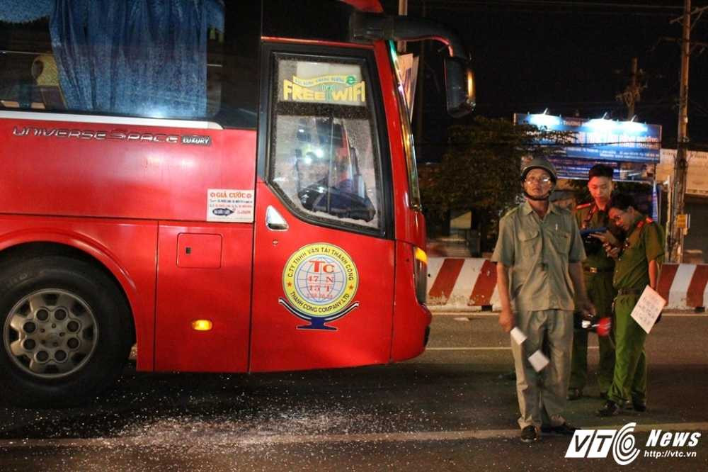 Tại hiện trường, xe khách dừng lại ngay giữa đường, kính xe bị đập bể rơi vãi khắp mặt đường.