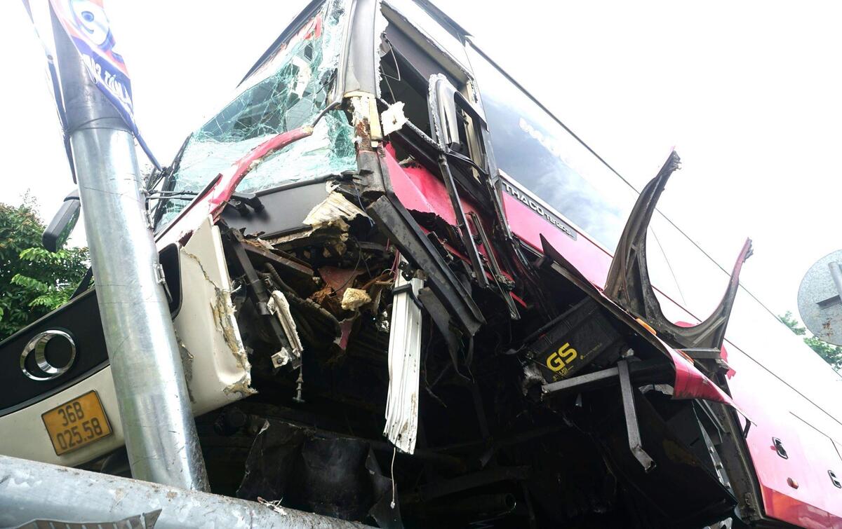 Phần đầu xe khách nát bét sau vụ tai nạn.