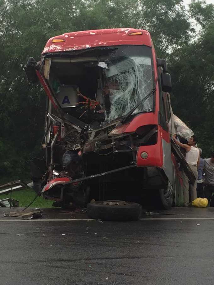 | Chiếc xe khách biến dạng phần đầu sau vụ tai nạn |