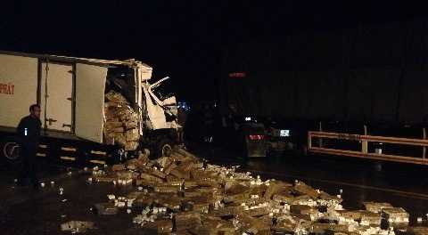 | Hàng hóa trên xe đông lạnh rơi vãi xuống đường |