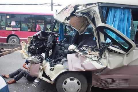 | Đầu xe khách vỡ nát, hư hỏng nặng |