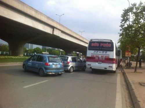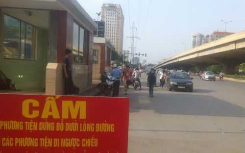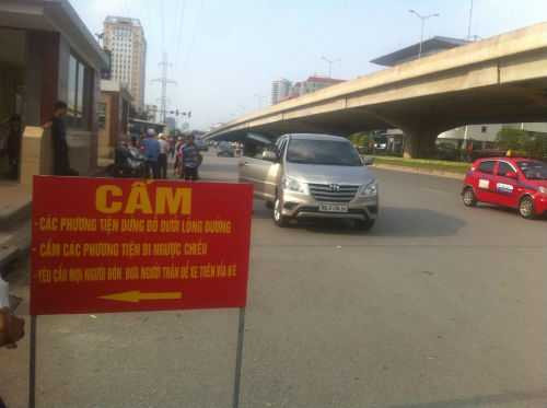 Ngay trước cổng bến xe Mỹ Đình, mặc dù ban quản lý phối hợp với cơ quan chức năng đặt biển cấm các phương tiện dừng đỗ nhưng hàng loạt ô tô, taxi vẫn hiên ngang vi phạm. Có trường hợp, xe khách dừng đỗ gần 20 phút đoạn đối diện bến xe nhưng cũng không thấy có lực lượng chức năng xử lý.