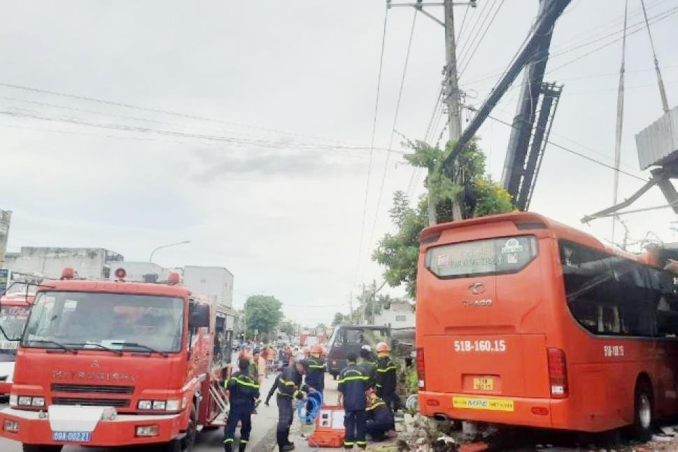 Tại hiện trường, xe khách nằm trên lề đường, tông sập một phần quán cà phê. Lực lượng cứu hộ và CSGT nhanh chóng có mặt tại hiện trường đưa hành khách ra ngoài và điều tiết giao thông.