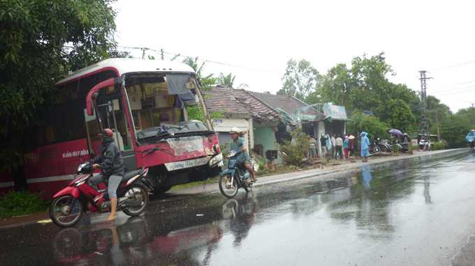 Vụ tại nạn làm hư hỏng hai căn nhà liền kề của gia đình ông Quyên, chiếc xe khách Phi Hiệp bị hỏng nặng phần đầu, kính xe vỡ văng tứ tung.