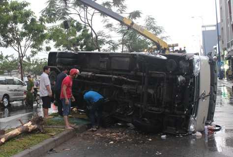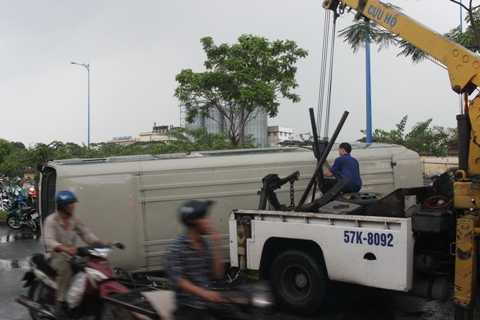 “Vì trời mưa, tài xế cho xe chạy chậm, nhưng do chiếc xe bị kẹt phanh, đường lại trơn do trời mưa nên chiếc xe bị lật ngang”, một hành khách đi trên xe cho hay.