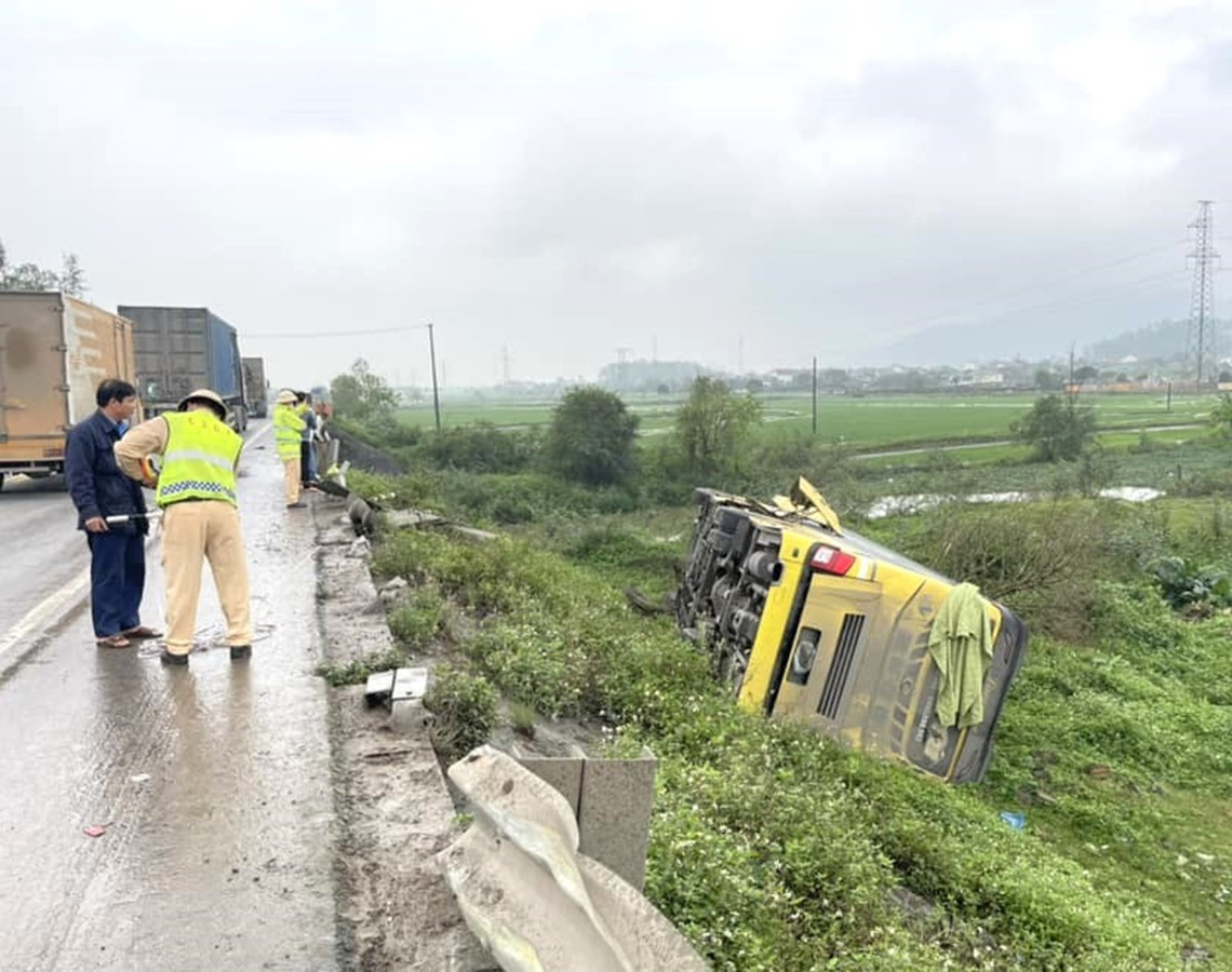 Trước đó, khoảng 11h cùng ngày, xe khách giường nằm của nhà xe Ngọc Tú đang chạy tuyến Hà Nội - TP.HCM, khi xe đi đến đường tránh Vinh đoạn qua địa bàn xã Nghi Diên, huyện Nghi Lộc (Nghệ An) thì bất ngờ đâm vào lan can, rơi xuống ruộng lật nghiêng.