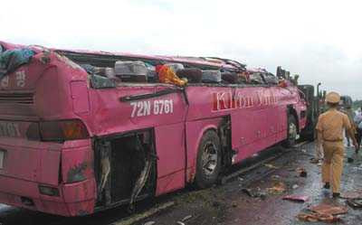 Khi chỉ còn cách chiếc xe ba gác chừng 2 m, tài xế giật mình đánh vội tay lái để tránh. Không ngờ trời mưa làm đường trơn trượt, xe mất trớn, lao nhanh xuống ruộng, lộn nhào, lật ngửa làm toàn bộ mui xe bị vỡ nát. Hậu quả, 15 người thương vong, riêng ông Huỳnh Sáu (81 tuổi, ngụ tại TP Phan Thiết, tỉnh Bình Thuận) đã tử vong trên đường đi cấp cứu.