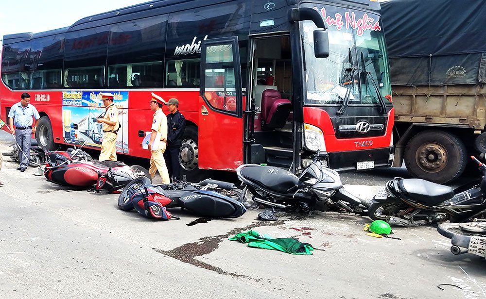 Lúc này, xe khách 46 chỗ mang BKS: 51B-183.10 do nam tài xế (chưa rõ danh tính) cầm lái, chạy trên quốc lộ 1 hướng từ quận 12 về huyện Bình Chánh bất ngờ lao đến đâm, cuốn hàng loạt xe máy vào gầm.