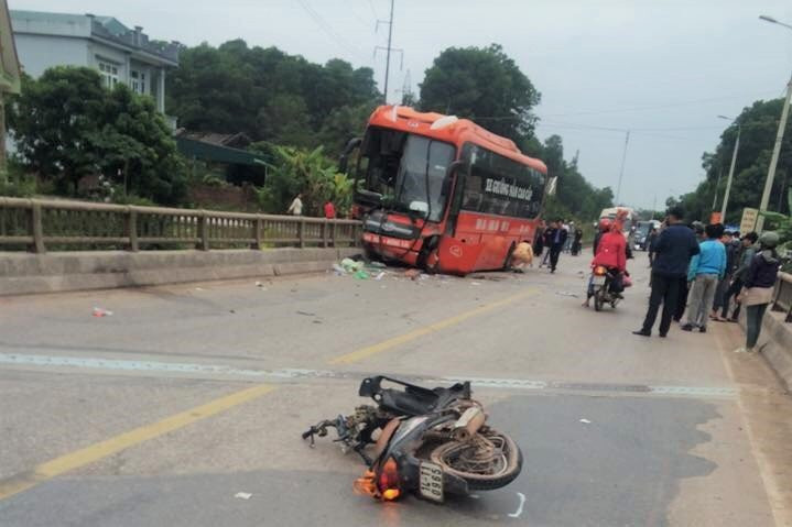 Sau cú va chạm, xe khách đâm xuyên lan can cầu. Ngay lúc đó, một chiếc xe máy BKS 14T3-1341 không làm chủ được tốc độ và khoảng cách đã đâm trực diện vào phần đuôi xe khách. Tuy nhiên, nạn nhân chỉ bị thương nhẹ.